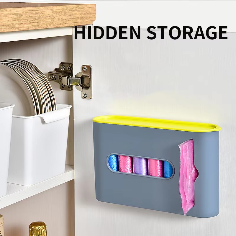 Wall-mounted garbage bag storage box, featuring a wall-mounted space-saving design, offers multi-roll storage, visual bag retrieval, and no need for drilling for installation. It adopts a contrasting color appearance, with a striking appearance level. It can be easily hung on kitchen cabinet doors and other positions without the need for drilling, and is easy to install. The box body has a transparent window, allowing a clear view of the remaining amount of the garbage bag inside, which is convenient for timely replenishment. The interior can simultaneously store multiple rolls of garbage bags, allowing the messy garbage bags to be neatly arranged and taken out as needed, saving space in areas such as countertops in kitchens and other Spaces.