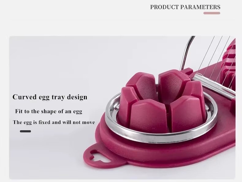 This is a practical multi-functional double-compartment egg slicer, available in white and red. It features a double-compartment design. One compartment can cut the egg into uniform slices, while the other can divide the egg into multiple sections. Made of high-quality materials, it has a stable structure, sharp and safe blades. It is easy and effortless to cut eggs. It can quickly shape eggs, preserved eggs and other egg ingredients into the desired form. The cut egg pieces are uniform in size and neat at the edges, making them convenient for plating or making salads, sandwiches and other delicacies. It brings great convenience to cooking and plating and is a good helper for handling egg ingredients in the kitchen.