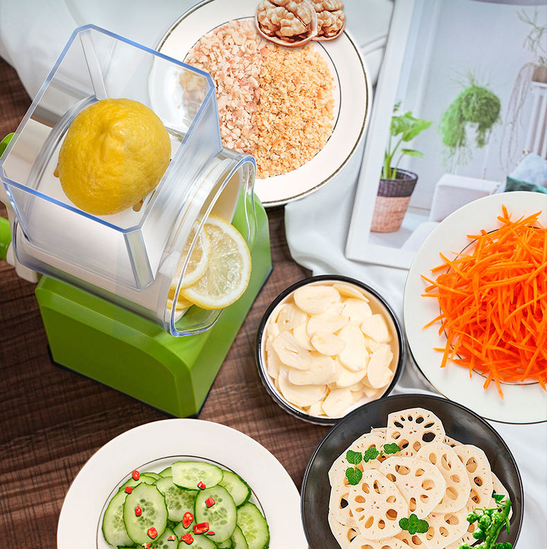 This is a hand-cranked multi-functional vegetable slicer. The main body is in a fresh green color, with a small and exquisite appearance. It is very beautiful and does not take up much space when placed in the kitchen. It adopts a manual crank operation mode and does not require electricity. When in use, just put vegetables and other ingredients into the feeding port at the top. By shaking the handle and with the help of the internal slicing device, the ingredients can be easily cut into uniform slices. It can be used to process various vegetables and fruits such as lemons, potatoes and carrots. The sliced ingredients are of uniform thickness and can meet various cooking needs such as salad making and side dish arrangement. Meanwhile, its structural design is reasonable and it is easy to disassemble and clean, providing an efficient and convenient solution for kitchen food preparation, which is highly practical for enhancing cooking efficiency.