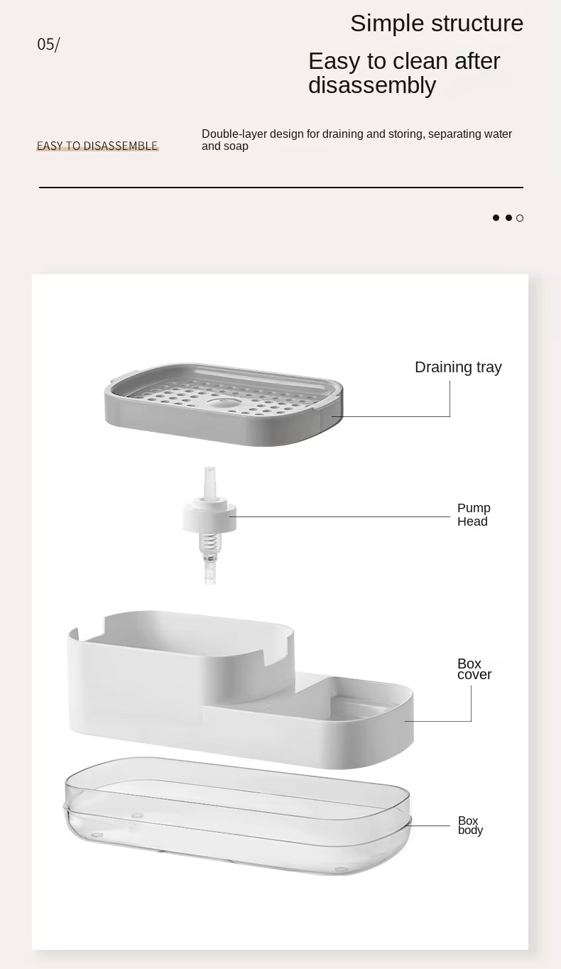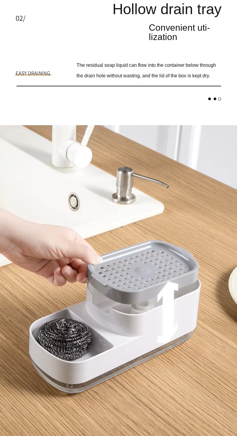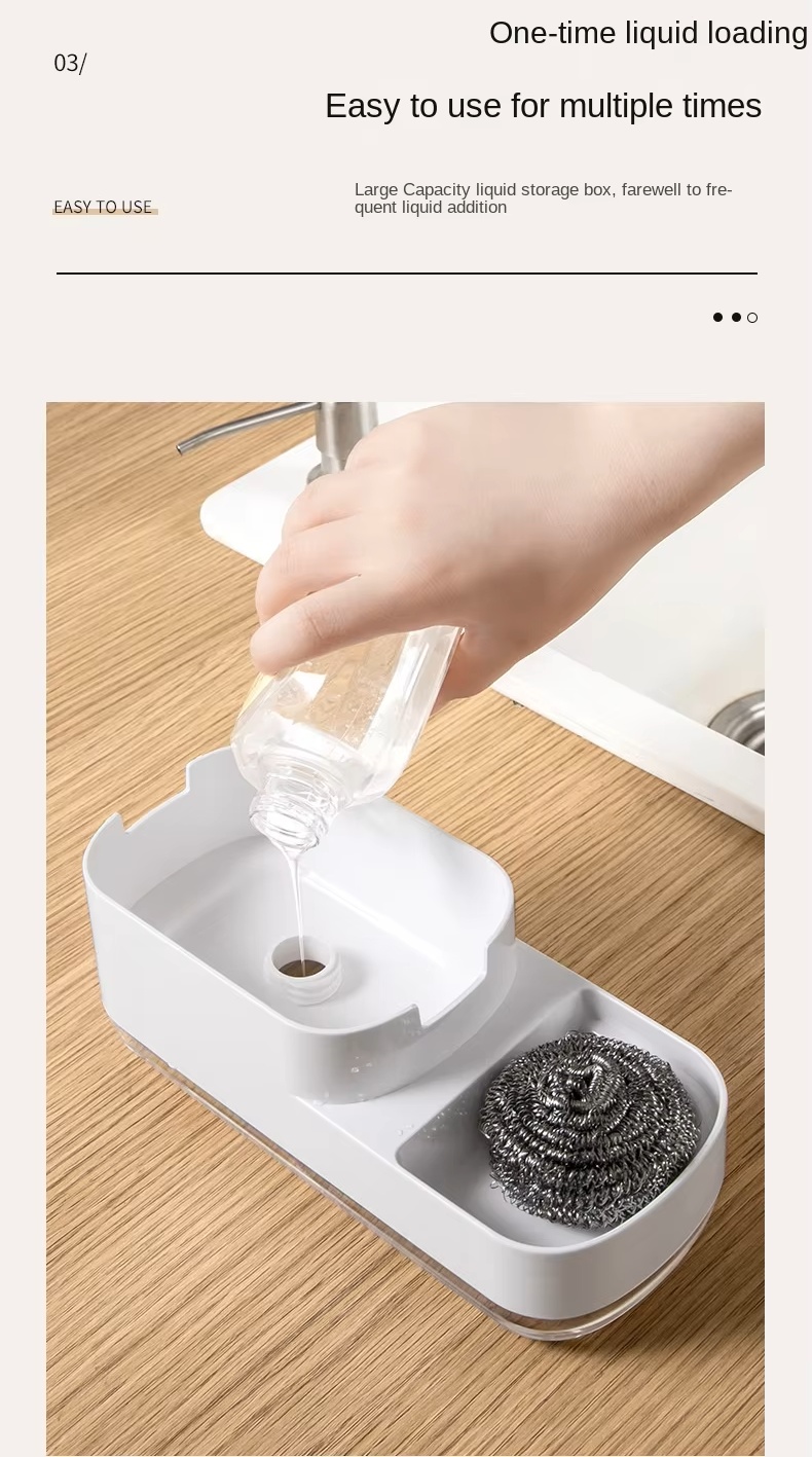 The manual press-type automatic liquid soap pump dispenser bottle is an innovative product for kitchen cleaning and storage, integrating core features such as pressing out detergent, zoned storage, and efficient water draining. It ingeniously designs a press-out liquid function. With just a gentle press, the detergent can flow out precisely, which is convenient and fast, solving the problem of inconvenient liquid extraction in traditional methods. Meanwhile, there are multiple independent zones where cleaning tools such as steel wool balls and sponge erasers can be classified and placed, avoiding clutter and cross-contamination. The hollowed-out water-draining structure can quickly drain the water off the cleaning tools, keep them dry and reduce the growth of bacteria. The product has a simple appearance with a fresh and fashionable blue and white color scheme. Placed beside the kitchen sink, it is both practical and aesthetically pleasing, greatly enhancing the convenience and tidiness of kitchen cleaning.