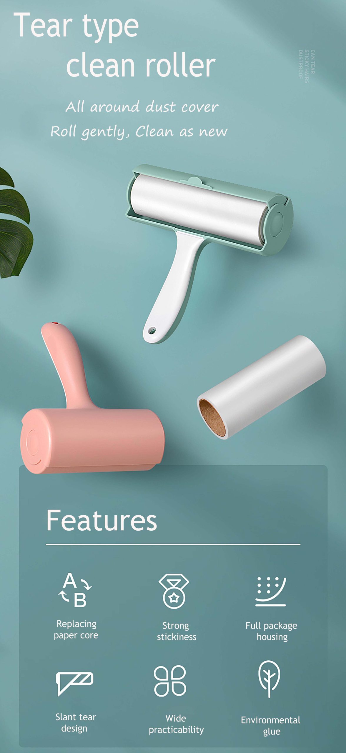 The full-cover dust removal drum has a fresh and elegant appearance. The main body adopts soft light tones (such as light green, light pink, etc.), and is paired with a simple white handle. The overall shape is smooth and round. It is equipped with a fully enclosed dust cover, which can effectively protect the sticky surface of the drum from contamination. The roller has a strong adhesive force. With a gentle roll, it can easily remove dust, hair and other debris from the surface of clothes, sofas, etc. Moreover, it adopts a slanted tear design, making it convenient and quick to replace the adhesive paper. The eco-friendly glue material is also very safe. Whether it is daily household cleaning or dealing with the trouble of pet hair, it can handle it with ease